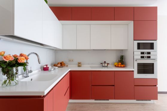 Бытовую технику лучше спрятать за фасадами встроенных шкафов. Благодаря этому приему кухонное помещение визуально будет выглядеть более просторным и свободным.