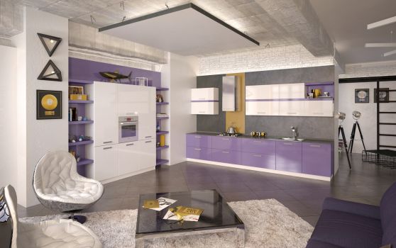 Фиолетовая кухня удачно впишется в интерьер в стиле лофт или модерн. Данный цвет выглядит свежо, привлекательно и интересно. При желании его можно обыграть декоративными элементами другого оттенка. Например, вставками, рисунками, мозаиками.