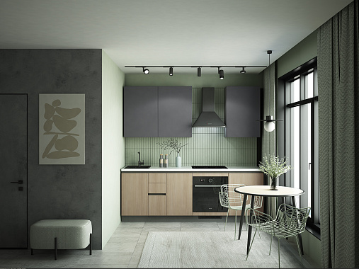 Несмотря на компактные размеры, Уна предлагает максимум удобства: антресольные шкафы увеличивают объём хранения, сохраняя визуальную лёгкость. Фасады мы изготовили из прочной экоплиты EGGER — качественного материала, устойчивого к воздействию влаги и механическим повреждениям. Все элементы продуманы до мелочей, чтобы кухня оставалась эргономичной, удобной и приятной в использовании на многие годы.