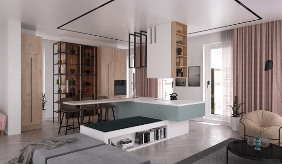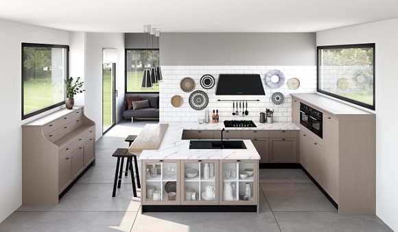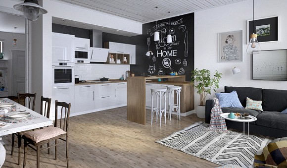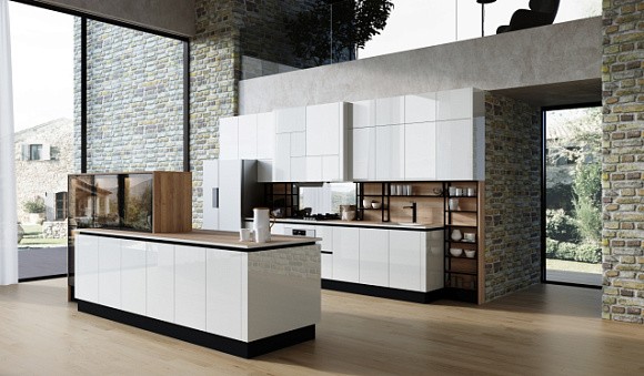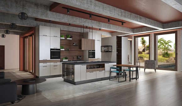 Островные версии обычно применяются в просторных квартирах-студиях и загородных домах. С помощью такого комплекта можно зонировать помещение, что актуально для пространств, в которых гостиная и кухня совмещены. Остров можно использовать в качестве дополнительной рабочей поверхности или обеденного стола.