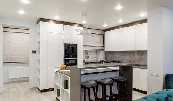Кухни светлых цветов с барными стойками можно подобрать для помещений любых размеров. Версии с небольшими складными конструкциями подходят для небольших комнат. В этом случае стойка может использоваться вместо стола для приема пищи, что сэкономит место.