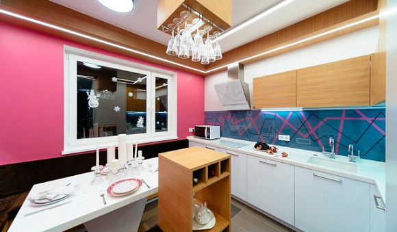 Кухни светлых цветов можно смело декорировать деталями красного, желтого, фиолетового, золотого оттенка. При этом использовать их можно для отделки фартука, острова или барной стойки.