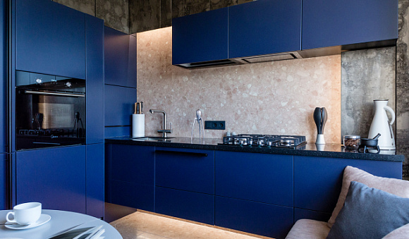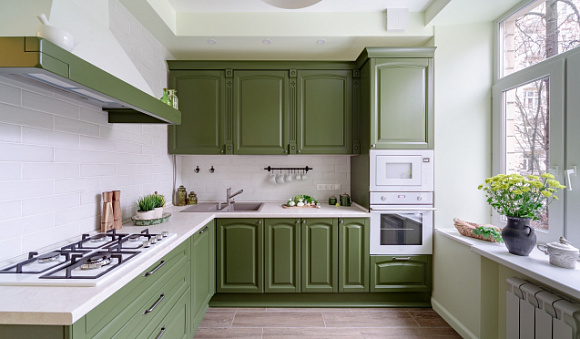 • Синие кухни или зеленые кухни можно дополнить минималистичным декором: вазами необычной формы, однотонными тарелками, столовыми приборами в одном стиле. Тогда кухня будет выглядеть эстетично.