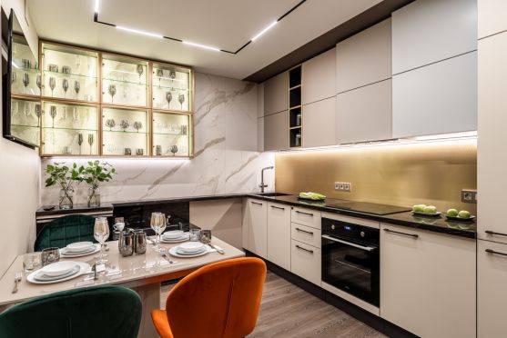 Функциональность. Планировка позволяет задействовать угловую зону, чтобы встроить в нее секцию для хранения посуды, полки или мойку.